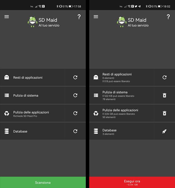 L’app inizierà a effettuare la scansione e, in pochi secondi, ti restituirà il risultato, elencandoti in quali sezioni dovrà intervenire tra: Resti di applicazioni (i file residui delle app rimosse dal dispositivo), Pulizia di sistema (la cache di sistema), Pulizia delle applicazioni (cache delle applicazioni, cancellabile solo con SD Maid Pro) e Database delle app.