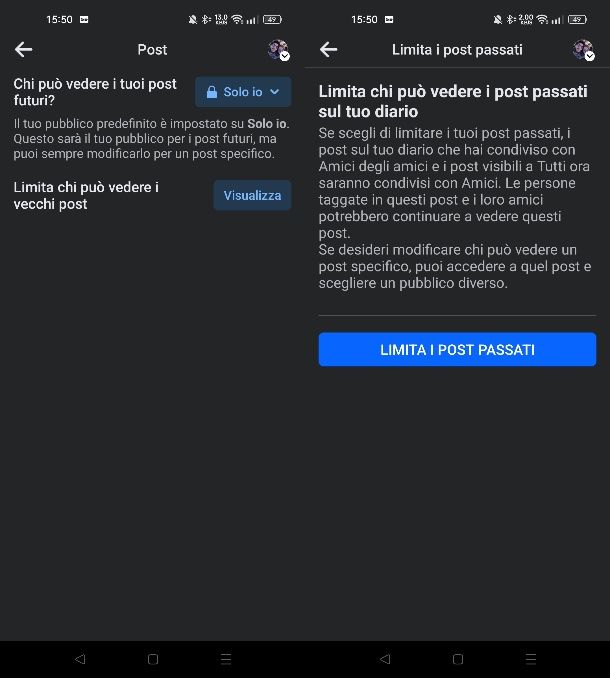 Arrivato a questo punto, modifica le impostazioni sulla privacy per quanto riguarda i post passati premendo il pulsante Visualizza che trovi esattamente a fianco della dicitura Limita chi può vedere i vecchi post. Conferma dunque la volontà di modificare tutti i tuoi post passati premendo sul tasto Limita i post passati. Facile, dico bene?