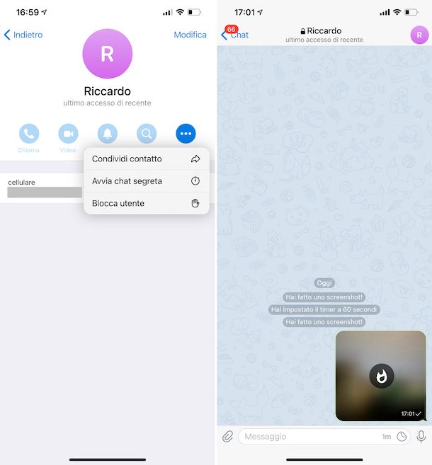 A questo punto, se la conversazione non è già stata trasformata in chat segreta, fallo tu al momento selezionando il nome dell’utente nella parte in alto della schermata, premendo il pulsante Altro, scegliendo l’opzione Avvia chat segreta dal menu che compare e sfiorando il pulsante Avvia.