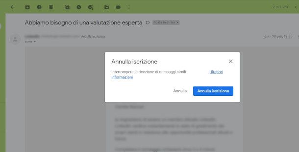 A questo punto, come anticipato poc'anzi, puoi agire in diversi modi per fare in modo che anche altre comunicazioni vengano dirottate verso questa sezione. Per cominciare, individua un messaggio che reputi indesiderato e aprilo, quindi verifica se a fianco dell'indirizzo del mittente è presente la dicitura Annulla iscrizione. Se la risposta è affermativa, puoi bloccare la ricezioni di comunicazioni di questo tipo premendo su di essa e confermando l'intenzione nella successiva notifica.