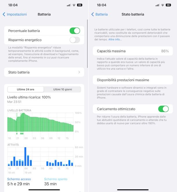 Per vedere la capacità di carica della batteria, fai tap sulla voce Stato batteria e, nella schermata che si apre, verifica la percentuale indicata alla voce Capacità massima. Se il valore indicato è inferiore all'80% (se l'iPhone è già stato usato) o inferiore al 100% (se l'iPhone è nuovo), sarebbe meglio rivolgersi al customer care di Apple per procedere eventualmente alla sua sostituzione o alla sostituzione del dispositivo stesso.
