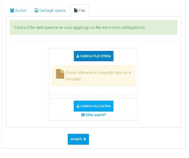 Arrivato qui devi assegnare il titolo alla tua opera e decidere che tipo di licenza attribuire. Dal menu a tendina seleziona TUTTI I DIRITTI RISERVATI, poi indica se il tuo lavoro è definitivo o se ancora in bozza. Successivamente fai clic sul pulsante CARICA FILE OPERA ed esegui l’upload del manoscritto. Puoi anche decidere se caricare materiale supplementare (Copertina, frontespizio ecc.), in tal caso ti basta cliccare su CARICA FILE EXTRA e selezionare il materiale da caricare. Una volta eseguito l’upload dai clic su AVANTI.