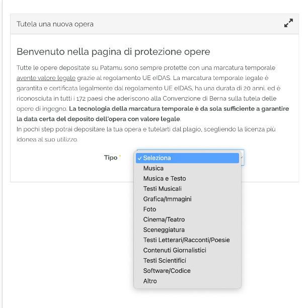 La migliore agenzia che attualmente copre in maniera completa il diritto d’autore per i software è Patamu, di cui ti ho parlato nei capitoli precedenti. Sai già che per creare un account devi visitare questa pagina, quindi passerò oltre e ti mostrerò direttamente come effettuare il deposito. Seguendo il percorso SERVIZI > Patamu REGISTRY > Tutela una nuova opera accederai al modulo che presenta un menu a tendina, quindi seleziona la voce SOFTWARE/CODICE.
