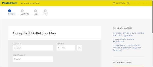 Controlla che tutti i dati siano corretti e clicca nuovamente su Continua. Puoi decidere di pagare utilizzando la PostePay, la PostePay Evolution o il tuo conto BancoPosta. Cliccando nuovamente su Continua, verrà ultimata la transazione. Nella pagina di conferma potrai infine scaricare la ricevuta relativa al pagamento del MAV appena effettuato.