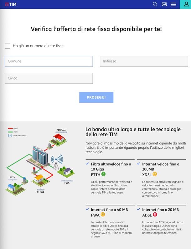 Per quanto concerne la linea fissa, puoi verificare la copertura della fibra di TIM recandoti su questa pagina e compilando i campi appositi indicando prefisso e numero di telefono (qualora tu abbia già una linea attiva)