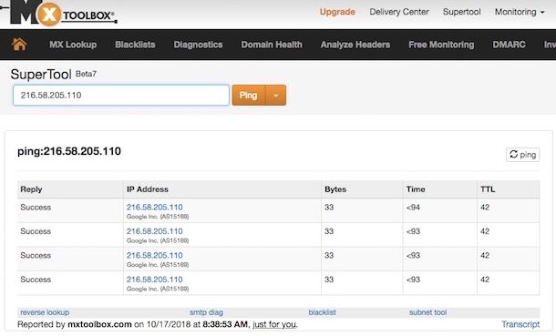 - MxToolbox — si tratta di un portale comprensivo anch’esso di diversi strumenti utili per il monitoraggio della rete tra cui è incluso anche un tool per pingare gli IP dei siti Internet. È gratis e funziona da qualsiasi browser e sistema operativo.