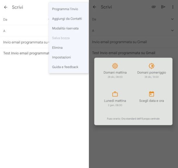 A questo punto, premi sull’icona ▼ a fianco del tasto Invia e, nel riquadro a schermo, scegli la voce Pianifica invio. Premi sulla dicitura Orario personalizzato, indicata la data e l’ora e poi premi sul tasto Invia.