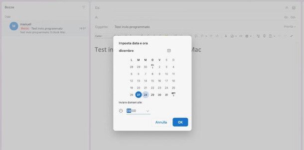 Ora, premi la funzione Scegli data e ora nel riquadro che ti viene contestualmente mostrato, dopodiché utilizza le funzioni di calendario ivi presenti per definire il giorno e l’orario di invio. Infine, premi il bottone Programma l’invio e il messaggio verrà spostato nella casella In programma, in attesa che arrivi il momento prestabilito per la spedizione.