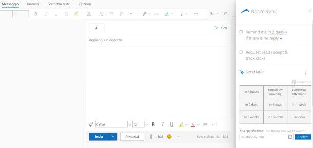 A partire da questo momento, quando termini la creazione un nuovo messaggio fai clic sul simbolo dei tre puntini orizzontali posto in basso nella barra degli strumenti, quindi seleziona dal menu contestuale il percorso Boomerang > Send later e utilizza una delle configurazioni predefinite proposte dal servizio o creane una custom mediante l’apposita opzione, definendo la regola che vuoi impostare nel pannello che si apre sulla destra.