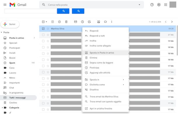 Ora che visualizzi l’elenco completo delle email presenti sul tuo account Gmail, individua il messaggio archiviato che intendi spostare nuovamente nella posta in arrivo (lo puoi trovare facilmente in quanto manca l’etichetta Posta in arrivo oppure, se lo ritieni necessario, puoi aiutarti digitando all’interno del campo di ricerca presente in alto il titolo, il nome del mittente, il contenuto del corpo ecc.), dopodiché facci clic destro sopra e seleziona la voce Sposta in Posta in arrivo dal menu contestuale.