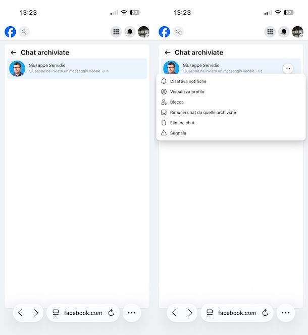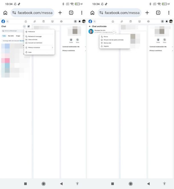 Una volta ricaricata la pagina, inserisci, dove richiesto, il nome utente e la password per accedere a Facebook e fai tap sul pulsante Accedi. Una volta giunto nella sezione Chat di Facebook, raggiungibile oltre che dal link che ti ho fornito anche premendo sull’icona del fumetto con il fulmine situata nella pagina principale del social network, tocca il pulsante con i tre puntini, seleziona la voce Chat archiviate.