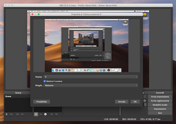 A questo punto, recati nuovamente sulla finestra principale del programma e imposta le fonti da usare per la cattura dei video, facendo clic sul tasto (+) sotto il riquadro Fonti in basso a sinistra, scegliendo la voce Cattura schermo dal menu che compare e premendo sul bottone OK per due volte di seguito. Provvedi poi a spostare e/o ridimensiona il riquadro con il desktop nella finestra di OBS per fare in modo che venga inquadrata la sezione di tuo interesse.