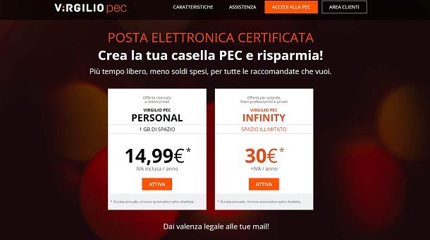 - Virgilio PEC Infinity: Questo piano è pensato per le aziende, i liberi professionisti e i privati che necessitano di spazio di archiviazione illimitato. È disponibile al costo di 30€ all’anno, a cui va aggiunta l’IVA.