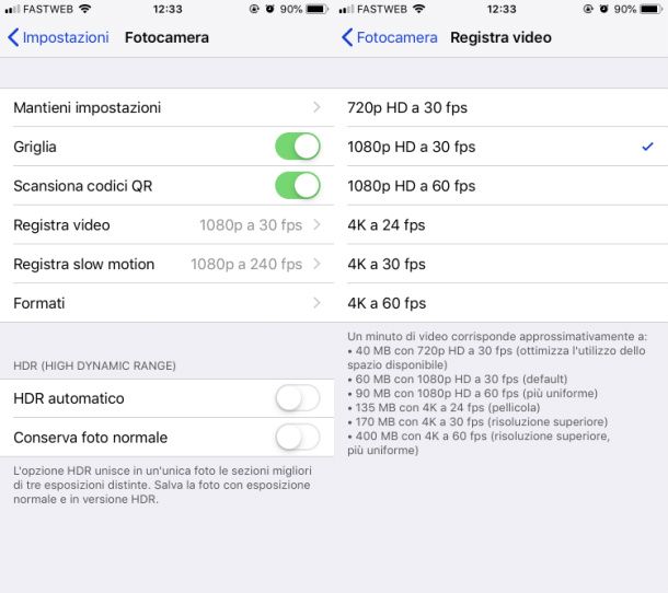 Puoi cambiare la qualità dei video registrati, regolando la risoluzione e altri parametri direttamente dalle impostazioni di iOS. Per fare ciò, avvia l’app Impostazioni (l’icona con l’ingranaggio), scorri l’elenco e fai tap sulla voce Fotocamera. Fatto ciò, nella schermata che si apre, individua la voce Registra video, per cambiare la risoluzione (HD 720, HD 1080p, 4K). Ricorda che, cambiando la risoluzione, il video occuperà più spazio nella memoria dell’iPhone. Tramite la voce Registra slow motion, puoi invece cambiare la risoluzione del video in modalità Slow Motion.