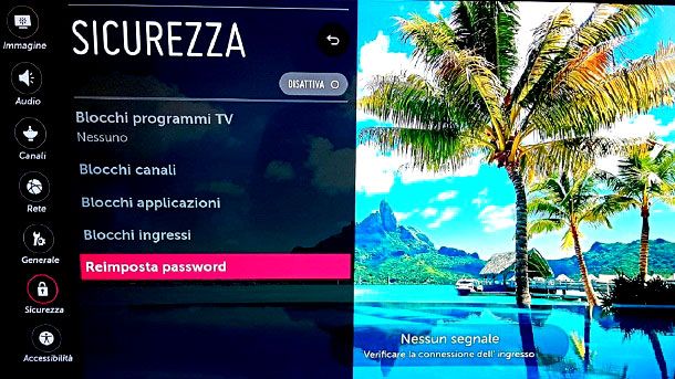 Per prima cosa, pigia sul pulsante ⚙ del telecomando, portati sull’icona (⋮) (Tutte le impostazioni) e premi quindi sul tasto OK. A questo punto, spostati nella sezione Sicurezza e, usando la freccetta verso destra del telecomando, portati sulla voce Reimposta password, senza però premere OK per confermare la volontà di procedere.