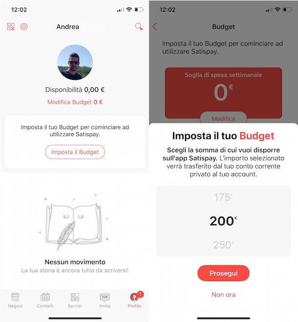 Dopo aver completato il caricamento del documento precedentemente scelto, premi sul pulsante Entra per completare la registrazione e per accedere al tuo account. Appena riceverai la notifica che la verifica dei tuoi dati è completa fai tap sulla voce Profilo, scegli l’opzione Imposta il budget e premi sul pulsante Modifica per definire la somma di denaro di cui vuoi disporre ogni settimana sul tuo conto Satispay (operazione necessaria per poter effettuare i pagamenti e per poter inviare denaro) scegliendo tra 25, 50, 75, 100, 125, 150, 175, 200, 250 o 300 euro.