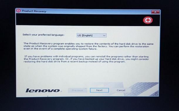 - Lenovo — premi il tasto Invio subito dopo l'accensione, così da interrompere la sequenza d'avvio del computer, quindi schiaccia la combinazione di tasti Alt+F11 oppure F11 per accedere all'utilità di emergenza. Infine, scegli l'opzione Lenovo Product Recovery oppure Factory Recovery e segui le indicazioni che ti vengono fornite. Maggiori info qui.