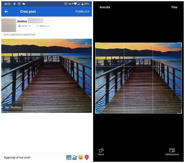 Se, invece, ti interessa ruotare leggermente la foto per raddrizzarla, premi sul tasto Modifica in alto a sinistra, clicca sulla scheda Ritagliare collocata in alto e utilizza il cursore che si trova in basso per definire l’angolo di correzione da applicare.