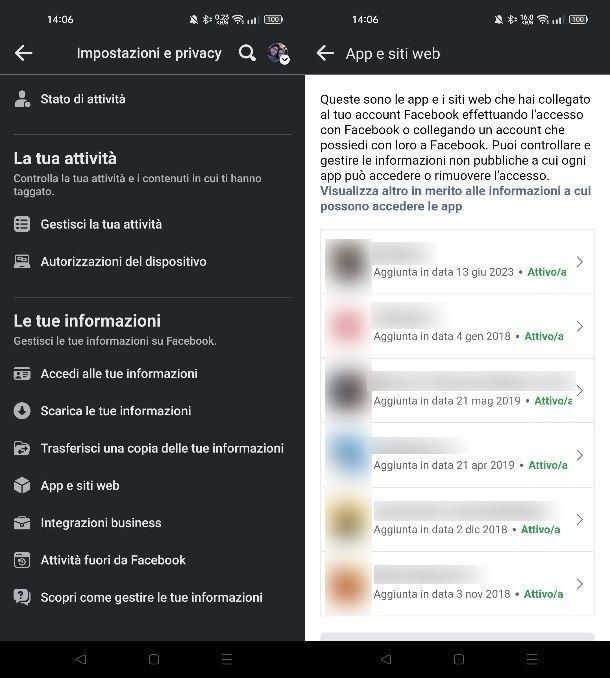 - Da mobile — accedi a Facebook dalla sua app per Android o iOS/iPadOS, fai tap sul pulsante (≡) e recati in Impostazioni e privacy > Impostazioni > App e siti Web. Nella schermata che si apre, fai tap sul nome del servizio da rimuovere e poi premi sul pulsante Rimuovi per due volte consecutive.