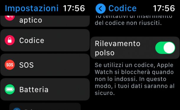 Apri l’app Impostazioni sul tuo Apple Watch (accessibile del menu delle applicazioni, richiamabile premendo la corona digitale dell’orologio). Nel menu che compare, cerca la voce Codice e premici sopra. Ruota quindi la Digital Crown o scorri con il dito fino alla fine di questa schermata, dove troverai un’ulteriore voce con accanto una levetta: Rilevamento polso. Premi su questa levetta e avrai così attivato l’utilissimo rilevamento del polso.