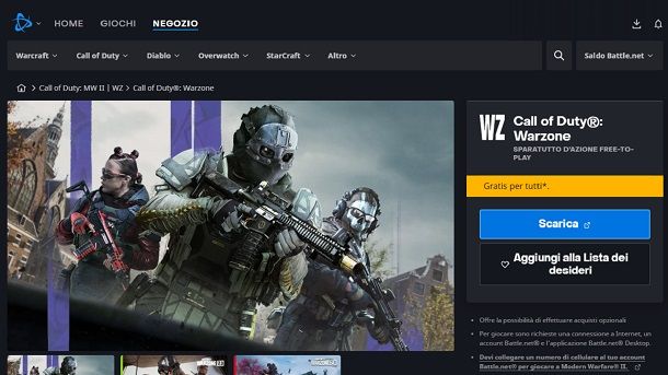 In ogni caso, una volta effettuato il login, potrai accedere al launcher Battle.net in modo completo. Una volta entrato in quest'ultimo, ti basterà dunque premere sulla voce NEGOZIO collocata in alto, spostare il mouse sopra all'opzione Call of Duty e fare clic sul riquadro Warzone. Dopodiché, scorrendo la pagina verso il basso noterai la presenza di tutte le possibilità del caso relative a COD, anche nell'ambito del capitolo principale della serie disponibile in questo momento: non ti resta che selezionare il riquadro Call of Duty: Warzone, ovvero quello che non ha un prezzo ma solamente l'indicazione Scarica, per poter così accedere alla pagina del gioco su Battle.net.