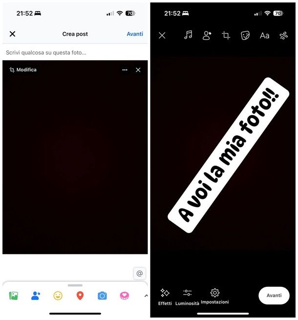 Chiaramente, dopo aver aggiunto le scritte alle foto di tuo interesse, puoi liberamente pubblicarle su Facebook come post o come storie, senza applicare cambiamenti ulteriori, seguendo le solite procedure previste dal social network.