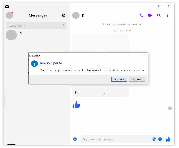 Se preferisci cancellare un singolo messaggio, premi sulla conversazione di tuo interesse, poi sul pulsante con il simbolo ⁝ che puoi visualizzare spostando il puntatore a sinistra, in corrispondenza del messaggio, e clicca sulla voce Rimuovi due volte di seguito. Utilizzi l’applicazione di Messenger per Windows e macOS? In questo caso, dopo averla avviata, per eliminare una chat, fai clic destro sulla sua anteprima e premi sulla voce Elimina la conversazione.