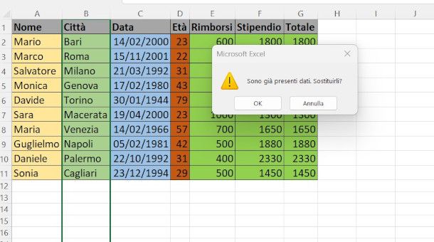 Se la destinazione corrisponde a un'altra colonna che desideri sostituire, ti basterà cliccare sull'opzione OK nella notifica che compare. In tal modo verranno trasferite anche le informazioni relative a formattazione e eventuali formule associate alle singole celle. In caso contrario, puoi sempre premere sulla funzione Annulla per tornare sui tuoi passi.