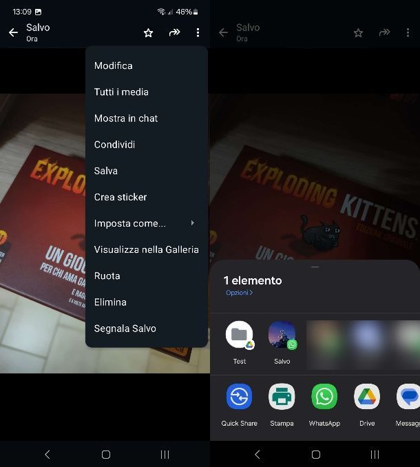 Se non trovi la foto da stampare, fai tap sul nome dell'utente o del gruppo in alto e premi sulla voce Media, link, documenti. Spostati sulla scheda Media, individua la foto, fai tap su di essa e pigia sull'icona di condivisione.
