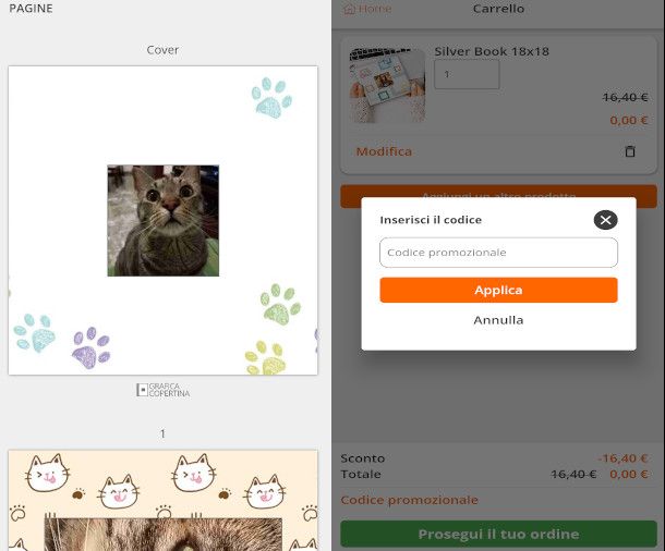 Dopo aver svolto questo semplice lavoro di editing, pigia il bottone Prosegui collocato in alto a destra e attendi che venga completato l'aggiornamento delle foto modificate sul sistema. Al termine, prendi visione del riepilogo dell'ordine con gli eventuali sconti applicati e fai clic sul bottone Prosegui ordine.