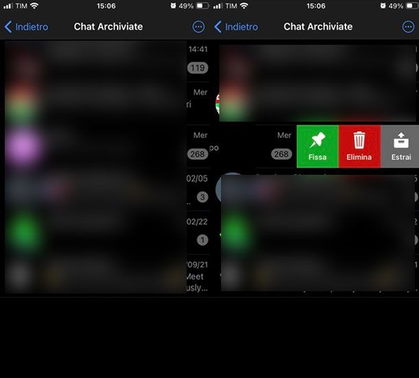 Qualora volessi invece eliminare definitivamente una conversazione precedentemente archiviata, accedi alla sezione Archiviate, fai un tap prolungato sulla conversazione da eliminare e scegli Elimina (su iPhone o iPad effettua uno swipe sula chat da destra verso sinistra, premi su Altro e seleziona l’opzione Elimina).