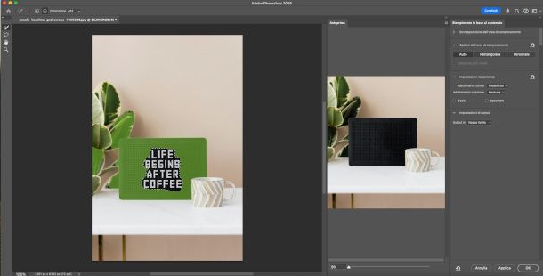 A seguire, fai clic sul menu Modifica > Riempimento in base al contenuto e attendi l'elaborazione automatica da parte del sistema: nell'arco di pochi secondi ti verrà mostrata una finestra con l'immagine originale e l'anteprima del risultato.