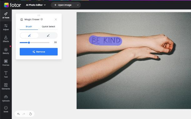 - Fotor — questa piattaforma Web di editing delle immagini alimentata dall'intelligenza artificiale dispone di un particolare strumento, denominato Magic Eraser, che si presta alla perfezione allo scopo. Occorre solamente evidenziare la scritta e premere il pulsante Remove per ottenere velocemente la cancellazione della stessa. Il servizio può essere provato gratuitamente, ma per poter usufruire di tutti i tool di editing offerti e scaricare le immagini rielaborate è necessario sottoscrivere un piano Pro, con costi a partire da 6,24 euro/mese e 7 giorni di trial.