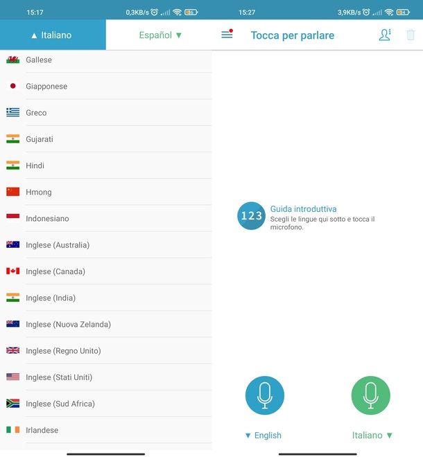 Una volta che hai installato Traduttore Vocale Istantaneo, avvia quest'ultima e premi sull'icona della bandiera italiana presente in basso a sinistra per selezionare la lingua d'origine dell'audio (es. Inglese); successivamente, premi sull'icona della bandiera in basso a destra per selezionare l'opzione Italiano.