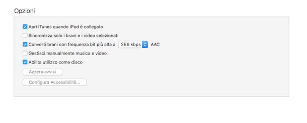 Pigia ora sull’icona dell’iPod presente nella parte in alto a sinistra della finestra visualizzata, assicurati poi che dalla barra laterale di sinistra sia selezionata la voce Riepilogo ed accertai del fatto che nella parte destra della finestra sia sputata la voce Abilita utilizzo come disco sotto la voce Opzioni.