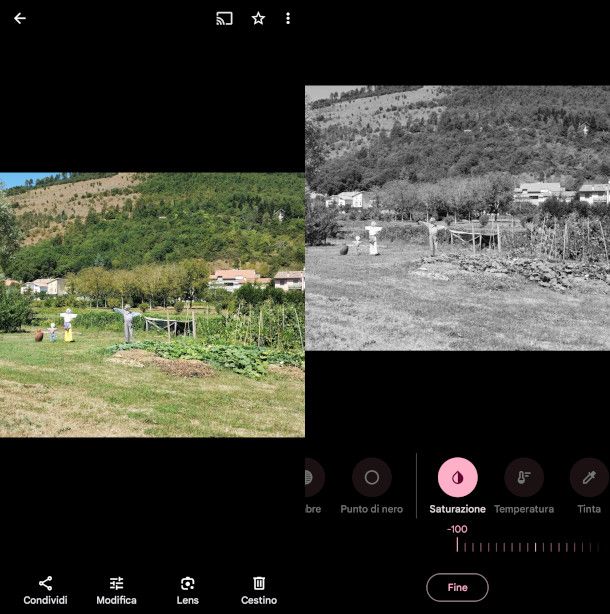 Una volta avviata (è quella con l'icona della girandola colorata presente in home screen o nel drawer), seleziona l'immagine e premi la voce Modifica posta in basso. A seguire, recati nel menu Regola, sfiora la voce Saturazione, quindi sposta la relativa barra di regolazione verso sinistra e tocca il bottone Fine.