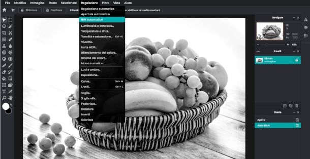 Se, invece, vuoi essere tu a definire tali regolazioni da zero, premi invece sul menu Regolazioni > Desatura, che cancella le informazioni sul colore senza ottimizzare il contrasto, dopodiché utilizza le altre funzioni del menu Regolazioni per gestire luminosità e altre caratteristiche dell'immagine.