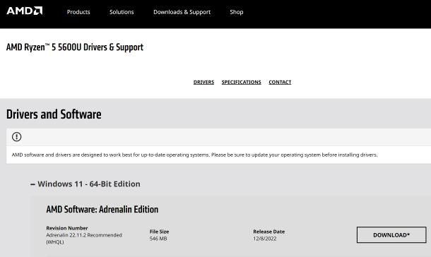 Fatto ciò, seleziona il sistema operativo da te in uso, l'edizione dello stesso (ad es. Windows 11 a 64 bit) e attendi qualche istante, affinché venga visualizzata la lista dei driver disponibili; quando ciò accade, clicca sul pulsante di download, esegui il file scaricato e segui le indicazioni che vedi sullo schermo, per portare a termine l'installazione dei driver necessari (è quasi sempre richiesto un riavvio del computer, alla fine della procedura).