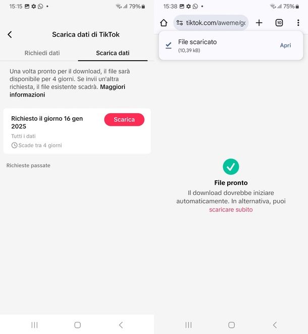 Fatto questo, si aprirà in automatico, sul browser Web che utilizzi sul tuo dispositivo, la pagina del sito ufficiale di TikTok tramite cui avviare il download dei dati richiesti: nel giro di qualche istante, partirà in automatico il download e riceverai un avviso al riguardo. Se il download non parte, dovrai premere su Scaricare subito, dunque effettuare il login alla piattaforma social e attendere l'inizio del download.