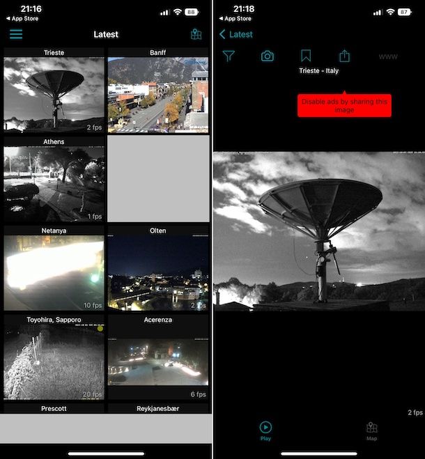 Successivamente, avvia PlanetCam sfiorando la sua icona appena aggiunta alla home screen e, una volta visualizzata la schermata principale dell’app, premi sulla miniatura della webcam di tuo interesse tra quelle elencate.