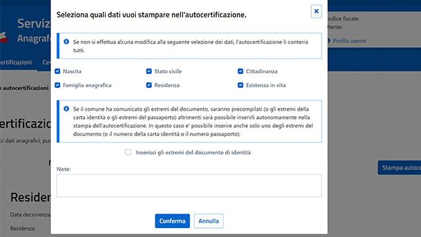 Si aprirà una schermata in cui scegliere i dati da includere nel documento, scegliendo anche di inserire o meno le estremità del documento d'identità attraverso l'apposita casella da spuntare, che risulteranno precompilate se il tuo Comune le ha comunicate al servizio, o immettendo delle note aggiuntive che puoi scrivere nella casella di testo in basso e che verranno aggiunte all'autocertificazione.