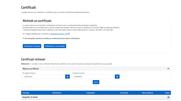 Ti ricordo, inoltre, che in fondo a questa pagina puoi visualizzare uno storico dei certificati richiesti e riscaricarli con l'icona a forma di freccia, situata a destra.
