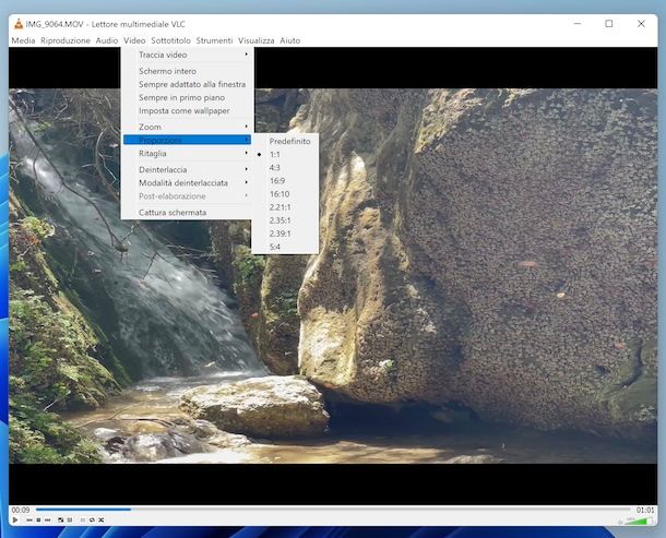 A questo punto, per cambiare le proporzioni del video che stai guardando, in modo da passare dal rapporto di forma predefinito a quelli personalizzati, clicca sul menu Video che si trova in alto a sinistra, evidenza il sotto-menu Proporzioni e seleziona l'opzione che preferisci tra quelle proposte nel nuovo menu (es. 4:3, 16:9, 16:10 e 1:1). In alternativa, puoi passare rapidamente in rassegna tutte le proporzioni disponibili premendo ripetutamente il tasto A sulla tastiera del computer.