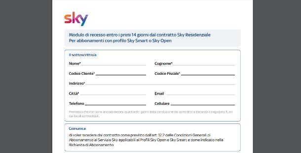 Una volta ottenuto il modulo, compilalo in tutte le sue parti specificando i dati richiesti e invialo all’indirizzo skyitalia@pec.skytv.it, a mezzo PEC, oppure all’indirizzo Sky Italia — Casella Postale 13057 — 20141 Milano, a mezzo raccomandata con ricevuta di ritorno.