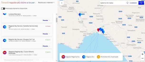 Solitamente, al termine dell’abbonamento, bisogna portare gli apparecchi Sky in proprio possesso presso uno Sky Service autorizzato. Per trovare quello più vicino a te, collegati a questa pagina del sito di Sky e fornisci il tuo indirizzo compilando l’apposito modulo. Dopo aver fornito l’indirizzo e aver premuto sul bottone Cerca, assicurati che la dicitura Restituzione decoder risulti selezionata (altrimenti fallo tu), in modo da così da visualizzare sulla mappa situata gli indirizzi dei vari Sky Service disponibili in zona.