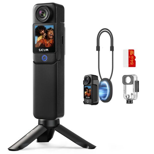 La SJCAM C300 è una videocamera tascabile per vlog che punta tutto su portabilità, autonomia estesa e riprese 4K stabili. Fin dal primo utilizzo colpisce il design allungato, estremamente leggero, che ti permette di tenerla in mano come un piccolo telecomando o di fissarla agli accessori inclusi senza aggiungere ingombro. Il fattore di forma portatile è studiato per accompagnarti ovunque, dallo sport alle riprese quotidiane, senza farti mai pesare la presenza della camera.