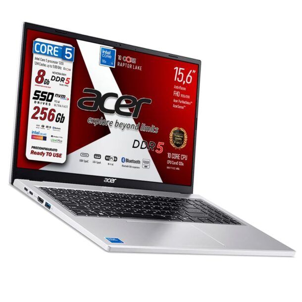 Questo Acer Extensa con Core i5 di 13ª generazione si presenta come un portatile pensato per chi cerca un equilibrio concreto tra prestazioni, qualità costruttiva e usabilità quotidiana. Il design argento con profilo ultra slim (circa 1,7 cm di spessore) e cornici sottili intorno allo schermo lo rende adatto a un contesto professionale, aziendale o di studio, con un aspetto sobrio ma moderno. Il peso dichiarato intorno a 1,7 kg lo rende sufficientemente comodo da trasportare, pur non puntando all’estremo della leggerezza.