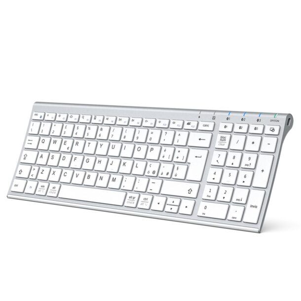 La Tastiera Bluetooth IClever è un'ottima soluzione per chi cerca una tastiera ricaricabile multi-dispositivo con un design ergonomico e connessione stabile. Compatibile con Mac OS, Android e Windows, questa tastiera si collega facilmente a PC, laptop, iMac, MacBook, tablet, smartphone, iPhone e iPad grazie alla sua tecnologia Bluetooth 5.1.