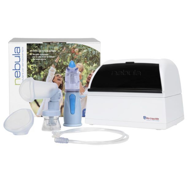 Nebula di Air Liquide Healthcare è un sistema completo di aerosolterapia pensato per offrirti una gestione strutturata delle patologie respiratorie di tutta la famiglia, con particolare attenzione sia alle alte sia alle basse vie aeree. Il cuore del dispositivo è un’unità compatta, di circa 23 x 18,5 x 18 cm e 1 kg di peso, facilmente collocabile in casa e abbastanza leggera da poter essere spostata senza difficoltà tra una stanza e l’altra, dettaglio pratico se devi gestire le terapie di più persone.