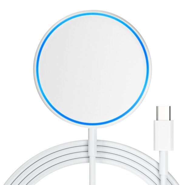 Questo caricatore magnetico bakibo da 15W è pensato chiaramente per accompagnare gli ultimi modelli di iPhone e gli AirPods compatibili, con un’attenzione particolare alla praticità quotidiana. Il formato è quello di un pad estremamente compatto (circa 6 x 6 cm, spesso meno di 1 cm) e leggero, appena 57 g, in materiale ABS solido e gradevole al tatto, in finitura bianca. Il cavo USB‑C integrato da 1,2 m è un dettaglio importante: non devi cercare un cavo separato e hai abbastanza lunghezza per usare l’iPhone mentre è in ricarica, sia alla scrivania sia sul divano.